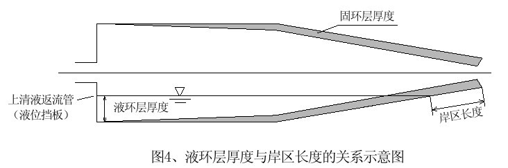 當(dāng)進(jìn)泥量一定時(shí),如果液環(huán)層厚度較大,污泥在離心機(jī)內(nèi)的停留時(shí)間長(zhǎng),污泥在液環(huán)層內(nèi)進(jìn)行分離的時(shí)間越長(zhǎng),會(huì)有更多的污泥被分離出來,并能夠降低某些小顆粒受擾動(dòng)而隨分離液流失的可能性,但液環(huán)層厚度過大,會(huì)造成水隨脫水后的污泥從污泥出口溢出;如果離心機(jī)內(nèi)的液環(huán)層厚度較小,污泥在離心機(jī)內(nèi)的停留時(shí)間短,工作壓力不容易提高,但脫水后的污泥含水率也較低。綜合以上兩方面的作用,液環(huán)層增厚一般會(huì)提高脫水的固體回收率,但液環(huán)層增厚,相應(yīng)會(huì)使岸區(qū)縮短,如上圖所示,使脫離液環(huán)層的污泥沒有充足的時(shí)間被甩干,因此泥餅含固率將下降。在控制液環(huán)層厚度時(shí)間應(yīng)