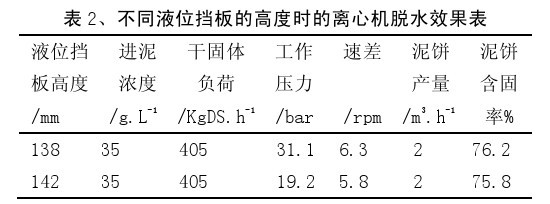 (6) 通過改變液位擋板的位置來調(diào)整離心機(jī)的液環(huán)層厚度,對(duì)離心機(jī)污泥脫水效果的影響非常大,必須通過反復(fù)的試驗(yàn),將液環(huán)層厚度設(shè)定在合適的水平,則可以保證污泥的含水率會(huì)降低,并且有較高的污泥產(chǎn)量;