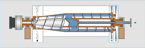 三相離心機結(jié)構(gòu)主要由差速器,螺旋,轉(zhuǎn)鼓、罩殼、機座、潤滑系統(tǒng)、電機等部分組成。其工作原理是:懸浮液經(jīng)進料管、螺旋出料口進入轉(zhuǎn)鼓。在高速旋轉(zhuǎn)產(chǎn)生的離心力作用下,比重較大的固相顆粒沉積在轉(zhuǎn)鼓內(nèi)壁上,與轉(zhuǎn)鼓作相對運動的螺旋葉片不斷地將沉積在轉(zhuǎn)鼓內(nèi)壁上的固相顆粒刮下并推出排渣口,不同比重的液相會在轉(zhuǎn)鼓內(nèi)形成兩道液環(huán),經(jīng)大端蓋的兩個不同的出口流出。